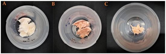 In the same way, Figure 5 illustrates the results obtained in the thermal stability study. Therefore, during the initial 12 h period, aerogels maintain their structural integrity, exhibiting no discernible alterations. However, after 24 h, a slight change in color is evident, which is attributed to the biodegradation process of the system due to the presence of high humidity combined with temperatures. Similarly, it can be seen that a notable volume loss occurs within the initial 48 h.