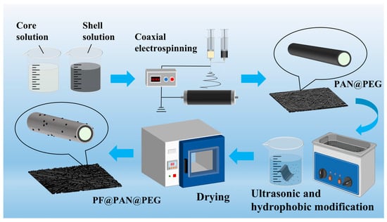 The preparation process of PF@PAN@PEG is shown in Figure 1. In summary, the novel PF@PAN@PEG composite PCM was prepared by pre-electrospinning PAN@PEG coaxial fibers using a coaxial electrospinning method, encapsulating PEG within PAN, and then imparting hydrophobic and oleophilic properties to it by immersing it in the hydrophobic modifier, further enhancing its light absorption capabilities.