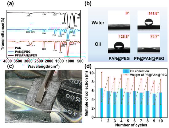 (a) FT-IR images of PAN, PAN@PEG, and PF@PAN@PEG; (b) the water and oil contact angle of PAN@PEG and PF@PAN@PEG; (c) photograph of PF@PAN@PEG immersed in water; (d) adsorption–desorption cycles of PF@PAN@PEG for crude oil collection over 10 cycles. The red line in this image represents the change of weight, where the solid line represents the deoiling process and the dotted line represents the oil absorption process.