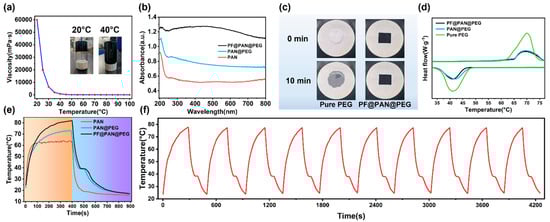 (a) The variation in crude oil viscosity with temperature, with images inserted showing the state of the crude oil at 20 °C and 40 °C; (b) UV–Vis absorption spectra of PAN, PAN@PEG, and PF@PAN@PEG; (c) leakage behavior of pure PEG and PF@PAN@PEG; (d) DSC images of PEG-10,000, PAN@PEG, and PF@PAN@PEG; (e) temperature change curves of PAN, PAN@PEG, and PF@PAN@PEG with light (1 kW/m2) and after the removal of light; (f) temperature change curves of PF@PAN@PEG during 10 photothermal cycles.