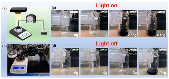 (a) Schematic illustration of PF@PAN@PEG for continuously collecting crude oil under simulated sunlight illumination; (b) device for continuous collection of crude oil on water with simulated sunlight illumination; (c,d) the crude oil absorption process with or without light.