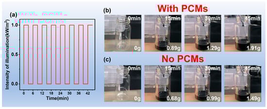 (a) The change in light intensity with time; (b) the crude oil adsorption process of adsorbents containing PCMs under the illumination changes described in (a); (c) the crude oil adsorption process of adsorbents without PCMs under the illumination changes described in (a).