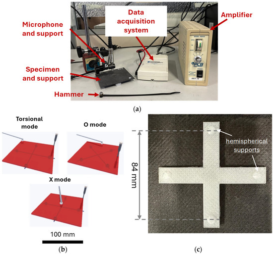 Figure 2 shows the IET system that has been used to assess the frequencies of undamaged and damaged plates. As illustrated in Figure 2a, the plates under investigation were supported on a base, and the microphone was opportunely positioned to detect a specific mode. The microphone signal was amplified and recorded using a data acquisition board, then analysed with Fourier Transform-based software, Buzz-O-Sonic (BuzzMac International, Portland, OR, USA) to evaluate the frequency response. The acquisition board, the NI USB-6210 system (National Instruments, Austin, TX, USA), was used for analog-to-digital conversion of the amplified signal. The position of the microphone supports and impact points where the hammer struck the plates allowed the excitation of a specific mode of vibration. In particular, the configurations for the torsional, O and X modes are shown in Figure 2b. These conditions are defined in the Software manual Buzz-O-Sonic [42]. The support is shown in Figure 2c. The hemispherical supports allowed the limit of the contact region, which should be as small as possible. The plate was moreover supported where nodal points were expected for a specific mode of vibration. In this way, the investigated mode was isolated, with a consequent limited influence of the other modes on the acquired signal. The distance between the sphere centres was 0.84 of the total length of the specimen, i.e., 84 mm.
