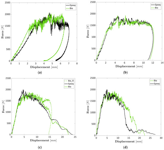 (a) Representative load–displacement curves for the laminates prepared with the epoxy resin at 5 J; (b) Representative load–displacement curves for the laminates prepared with the epoxy resin at 7 J; (c) Representative load–displacement curves for the laminates prepared with the bio-resin at 5 J; (d) Representative load–displacement curves for the laminates prepared with the bio-resin at 7 J.