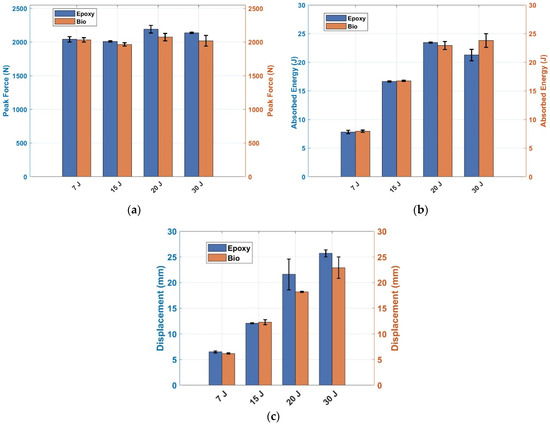 Ultimate displacements are shown in Figure 4c. At 7 and 15 J, the ultimate displacements of both specimens prepared with the two resins were the same due to the rebound. At 20 J, the bio-based laminate presented lower displacement values due to the rebound of the specimens prepared with bio-resins. At 30 J, the displacement values of the specimens prepared with epoxy resin looked larger. However, the main significant drop occurred before 15 mm, and then the load remained constant between 100 and 200 N before going to 0 N. The specimens prepared with bio-resin presented a significant drop in the load at around 20 mm, which allowed them to absorb more energy during failure.