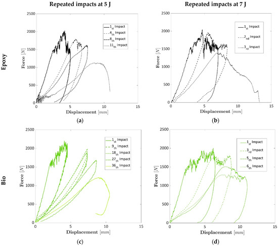Repeated tests were carried out to assess whether the specimens prepared with bio-resin presented higher resistance at repeated impacts due to the larger displacements they presented in the perforation tests. Figure 5a and Figure 5b show the repeated impact tests for the epoxy-based laminates at 5 J and 7 J, respectively. Figure 5c and Figure 5d display the repeated impact tests for the epoxy-based laminates at 5 J and 7 J, respectively. Different representative curves were chosen for each laminate due to the different numbers of obtained repetitions to highlight the damage progression among the different impacts. The damage progression can be shown by the decreased stiffness value (initial trend of the curves) and the increased displacement during repeated tests. The repeated impacts showed that at 5 J, the epoxy-based laminates bore 11 impacts, while the bio-based laminates reached 36 impacts. At 7 J, the conventional epoxy-based laminates bore three impacts, while the composite bio-based resin failed after six repeated impacts. The most significant differences between laminates prepared with epoxy and bio-resins can be found in the first drop of mechanical properties when the first peak was reached at both 5 and 7 J and the rebound of the dart that was identified with the values of the negative displacements in the load–displacement curves. The first curve of the epoxy laminates impacted at 5 J and 7 J showed a slight drop before 5 mm, Figure 5a,b, that was not present in the specimens prepared with bio-resin, Figure 5c,d. During the damage progression, the laminates prepared with bio-based resin exhibited higher force values sustained over more significant displacements, indicating superior residual elastic properties and lower damage levels than those made with epoxy resin under the same number of impacts. This highlights the ability of bio-based resins to maintain a more consistent and elevated load capacity over repeated impacts. This trend is visible when comparing the first and the last curves of epoxy and bio-based epoxy at both 5 J and 7 J. Contrarily, the curves of the epoxy-based laminates present lower values of the forces after the maximum peak, which leads to a lower absorbed energy. Finally, the bio-based composite plates presented a higher rebound up to the failure, which means a higher residual energy. The meaning of this behaviour is attributed to the higher deformation that the epoxy bio-based resin can offer before failure, with a consequent higher number of impacts for the resin prepared with the bio-based resin.