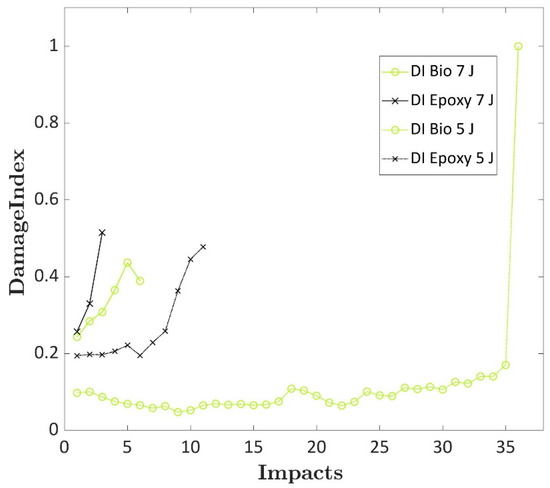 The DI was computed to analyse the damage progression of the epoxy and bio-based laminates to repeated impacts, and the curves are shown in Figure 6. Usually, the last impact that is carried out on the laminates presents low absorbed energy due to the limited residual strength or a very high energy based on the extensive displacement that the specimens can reach after failure with a force increase due to the friction of the dart and the fractured specimens. A DI of 1 was assigned to the last impact for this latter case. The DI computed for the laminates impacted at 5 J showed that both laminates presented very different DI values due to the different damage progression depicted for the two types of specimens. In particular, the DI of the biospecimen impacted at 5 J presented an initial value that was half the epoxy specimen value when impacted at the same energy. Then, when damages started to increase, the DI values significantly increased for both laminates before failure. This increase was more evident for the epoxy specimen, where the DI value rose from an average value of 0.2 to a maximum value of 0.5.