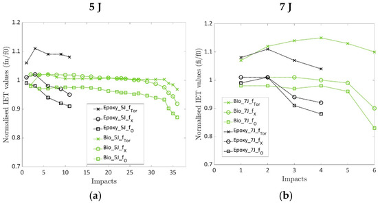 (a) Normalised IET computed for the epoxy and bio laminates at an impact energy of 5 J; (b) Normalised IET computed for the epoxy and bio laminates at an impact energy of 7 J.