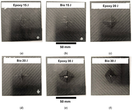 Figure 9 displays the representative fracture surfaces of the perforation tests at 15 J, 20 J and 30 J for the plates prepared with epoxy and bio-resins. The fracture surface at 7.5 J has not been reported since tiny indentations were detected. The surfaces of the specimens impacted at 15 J, Figure 9a,b, showed that the plate prepared with epoxy resin presented split cracks in two directions, while the specimens prepared with bio-based resin presented closed superficial cracks. The epoxy and bio-based impacted specimens at 20 J, Figure 9c,d, showed that the damaged area presented similar sizes. However, the specimens prepared with epoxy resin presented an evident open indentation related to the failure of the laminates. On the other hand, the biospecimens experienced a rebound at 20 J, as reported in Section 3.1. Finally, the specimens impacted at 30 J showed that both specimens prepared with epoxy and bio-based resins, Figure 9e,f, presented similar failure surfaces, sizes, and opened cracks. However, the open patches were smaller and less open for the specimens prepared for the bio-based resin.