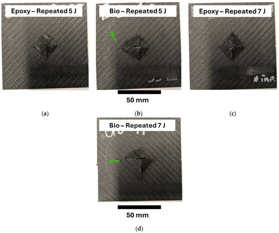 Figure 10 reports the specimens subjected to repeated impact tests at 5 J, Figure 10a and Figure 10b, and at 7 J, Figure 10c and Figure 10d, respectively, for plates prepared with epoxy and bio-resins. Figure 10 shows that the plates prepared with the epoxy resin and impacted at 5 J and 7 J presented similar fracture surfaces. The size of the damaged area and the shape were symmetric and quite close to the specimens impacted at 30 J, where complete perforation occurred. On the other hand, the plates prepared with the bio-based resin and impacted at 5 J and 7 J presented similar damage areas that were slightly longer on the left side, Figure 10b,c. This indentation was the result of the higher number of impacts that these specimens bore. The damaged area was slightly higher for bio-based due to the higher displacement that these specimens bore. Likely, the ductile behaviour of the plates prepared with bio-based resin triggers a different damage mechanism, and the interlaminar crack propagates before the final fragile failure. This behaviour involved a wider part of the plates in the damage progression. Indeed, the plates presented a tiny indentation close to the circular support, as shown by the green arrow. The frequencies computed throughout the IET also showed that this technique could detect greater damage. Indeed, the specimens impacted at 5 J presented a final value of 0.86 and 0.90 for the specimens prepared with bio and epoxy resins, respectively. The final values for specimens impacted at 7 J were 0.82 and 0.88, respectively, for the bio and epoxy resins. Thus, the plates with greater damage, the biospecimens, presented a higher drop in frequency.
