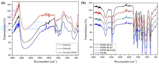FTIR analysis was used to depict the IR spectra of the ferrite nanoparticles, pristine PU, and PUNFs as presented in Figure 1. In all spectra of the ferrite nanoparticles, the strong peak at around 580 cm−1 and the small peak at around 490 cm−1 were assigned to the vibrational frequency of Fe-O and the stretching vibration of the M-O band (M= Cu, Zn, Cu0.5Zn0.5) [46]. In addition, the O–H stretching vibration of H2O could be associated with the peaks observed at around 3350 cm−1 due to moisture absorption in the ferrite nanoparticles [46,47].