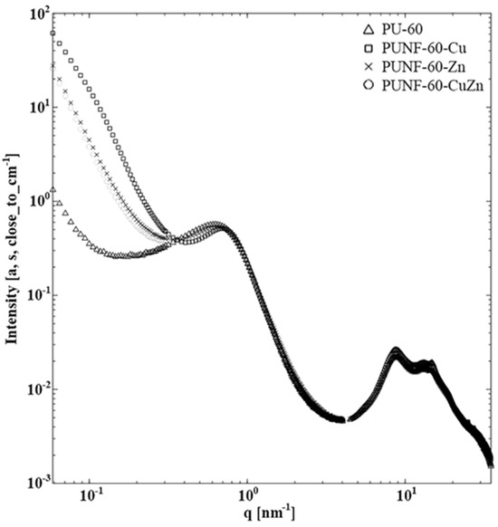 Figure 2, which covers the entire SWAXS experimental region, shows that the scattering curves were hardly distinguishable up to the first maximum, i.e., q = 1 nm−1. The differences were highlighted when the scattering of the pure PU-60 system was subtracted. At the lowest qs, it is evident that the system does not correspond to particles but rather to globular regions whose size was too large, so that only the tails of the SAXS scattering curves were visible; for this reason, we can only estimate some parameters and compare them between the materials. Table 3 shows the estimated values for the radius of gyration Rg [nm−1], the intensity at zero angle I0+, the slopes, the lamellar distance [nm], and the size of the domains from the first minimum R1m [nm]. It must be stressed that we are working with rough estimates, or rather pseudo-parameters, obtained under conditions far from those expected by SWAXS theory. However, our rough estimates are consistent with the interpretation in the literature. Most spectacular was a steep upward jump at I0+ and a downward jump at R1m. Both changes can be attributed to the use of heavy atoms as nanofillers. When using the position of the first minima, we must consider that the scattering when using nanofillers is the superposition of information from these and the original network. The lowest angular region of the PUNF-60-Cu curve was clearly different from the rest as it has two distinct slopes. This can probably be attributed to the higher roughness of the filler nanoparticles. This explanation is supported by the AFM results (see below) and the higher protein adsorption (see below), while the other parameters were similar to those of the other measured systems.