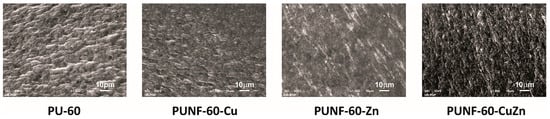 The typical bands related to the polyurethane structure were observed in the FTIR spectra of pristine PU and PUNFs (Table 1) [46]. The complete consumption of isocyanate groups is proved by the absence of NCO stretching vibrations at around 2270 cm−1 in all materials.