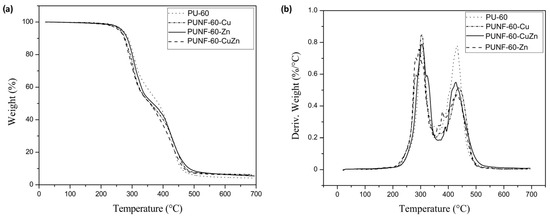 The TGA thermograms of the pristine PU and PU NC films in a nitrogen atmosphere are presented in Figure 4. T10% denotes the temperature at which a material starts to degrade, relevant for its thermal stability (Table 5). The start degradation temperature decreased in the following order: PUNF-60-Zn > PUNF-60-CuZn > PUNF-60-Cu (Table 5). These data show that the T10% for PUNF-60-Cu (T10% = 283 °C) was slightly lower compared to the other prepared PUNFs (T10% = 286 and 285 °C for PUNF-60-Zn and PUNF-60-CuZn) and pristine PU (T10% = 287 °C). This can be attributed to phase mixing, which causes significant weight loss in the initial phase of thermal degradation. This observation suggests that nanoparticles, especially copper nanoferrites, disrupt the hydrogen bonds in the hard segments and, therefore, determine a lower temperature for chain degradation, which also increases the decomposition rate [36]. It is obvious that the temperature of the first decomposition peak was higher for the prepared PU NCs than for pristine PU. This indicates a higher thermal stability of the prepared PU NCs compared to pristine PU. Only PUNF-60-Zn showed comparable thermal stability (T10% = 286 °C) compared to pure PU (T10% = 287 °C). The prepared PUNF with zinc ferrite nanoparticles exhibited the best thermal stability compared to the other prepared PUNFs, which is probably due to the good compatibility and better dispersion of the ZnFe2O4 nanoparticles within the PU compared to CuFe2O4 and Cu0.5Zn0.5Fe2O4 nanoparticles.