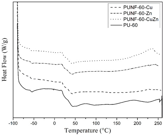 The DSC thermographs, measured in the range of −90 to 230 °C (Figure 5), show that each material had a glass transition temperature (TgHS) of hard segments. The TgHS of the PUNFs ranged from 26 to 29 °C while that of pristine PU was 29 °C (Table 5). The TgHS of the PUNF-60-Zn and PUNF-60-CuZn materials was lower than that of pristine PU. The relatively low TgHS values indirectly indicate stronger interactions between the nanoparticles than between other components in the PUNFs. Thus, the free volume was increased, and the chain flexibility was enhanced by nanoparticle addition, as this disrupted the crosslinking of the polymer network [33,35]. The DSC thermograph results obtained agree with those of the crosslinking density of the prepared PUNFs (see below).