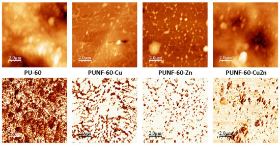 The resistance of a material to local surface deformation is indicated by the measured hardness, while its stiffness is characterized by the elastic (Young’s) modulus. In our study, the different types of ferrite nanoparticles affected the mechanical properties of PU NCs: both the elastic modulus and hardness were greater in PUNF-60-Zn (184 MPa and 41 MPa) and lower in PUNF-60-Cu (152 MPa and 31 MPa) and PUNF-60-CuZn (142 MPa and 27 MPa) compared to pristine PU (170 MPa and 31 MPa). The addition of zinc ferrite nanoparticles in PU increased Young’s modulus and hardness of PUNF-60-Zn by 8.23% and 32.25%, respectively, compared to pristine PU, meaning the nanocomposite was stiffer. This effect could be correlated with efficient reinforcement and the fact that the zinc ferrite nanoparticles were very well dispersed in the polymer matrix. Certainly, these results show the improved stiffness and hardness of the material with zinc ferrite nanoparticles incorporated into the PU matrix. The higher Young’s modulus (Table 4) for the ZnFe2O4 nanoparticle-based PUNF also shows better compatibility and dispersion of ZnFe2O4 than CuFe2O4 and Cu0.5Zn0.5Fe2O4 nanoparticles in the polymer matrix. The large surface area of the nanoparticles and the strong interaction between the nanoparticles within the PU matrix account for the improved elastic modulus of PUNF-60-Zn. Furthermore, the observed less desirable mechanical properties of the other NCs we prepared could be due to the poorer dispersion of the copper- and copper–zinc ferrite nanoparticles, which led to more defects in the composite networks.