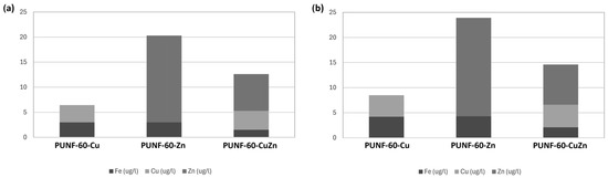 The PUNF films were extracted according to Pergal et al. (2022) [22], with the exception that we used rectangular films (10.0 mm × 15.0 mm × 1.0 mm ± 0.2 mm). Concentrations of metal ions were analyzed using MP-AES (MPAES 4200, Agilent Technologies, Santa Clara, CA, USA), as reported previously [22].