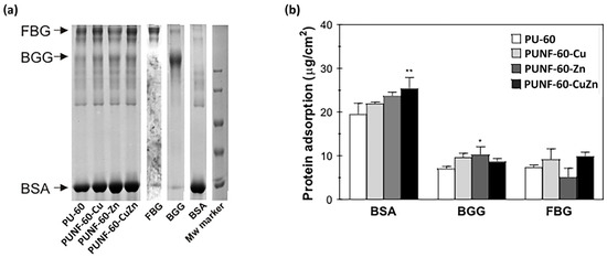The protein adsorption capacity of PUNFs was investigated under the same conditions as previously reported by us for other materials [43]. Samples were incubated in a mixture of proteins dissolved in phosphate-buffered saline (PBS, 8.7 g L−1 K2HPO4, 6.8 g L−1 KH2PO4, and 8.76 g L−1 NaCl, pH 7.4) for 2 h at 37 °C. The adsorbed proteins were separated electrophoretically on 6% SDS-polyacrylamide gels under non-reducing conditions. After staining the gels with Coomassie Brilliant Blue R-250, the protein bands were visualized by iBright and quantitatively analyzed using iBright Analysis software (v5.1.0.). The amount of adsorbed proteins was calculated using standard curves generated simultaneously with the samples. The results are expressed as µg protein/cm2 film.