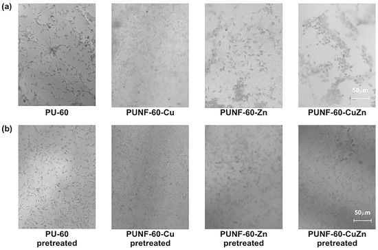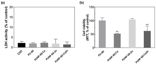 It is well established that ZnFe2O4 and CuFe2O4 nanoparticles exhibit marked antioxidant properties, which emphasizes their potential to attenuate oxidative stress [46,68]. One reason for the detected antioxidant potential of our PUNFs could be their capacity to transfer electrons from the oxygen atom of the nanoparticles to the nitrogen atom of DPPH [46]. Moreover, the ability of antioxidant metal ions to neutralize free radicals has also been demonstrated in previous studies [46,69]. In addition, clear evidence exists for the claim that ZnFe2O4/cellulose-based nanocomposites are useful natural antioxidants against oxidative stress associated with degenerative diseases [70]. Accordingly, the results obtained show PUNF-60-Zn had the highest antioxidant activity compared to the other prepared PUNFs and pristine PU. Thus, these results suggest that the incorporation of zinc ferrite nanoparticles into the PU matrix significantly improves the antioxidant capacity of PUNFs.