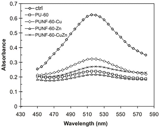 The implantation of biomaterials in the body may trigger oxidative stress, which leads to inflammation, chronic diseases, and other health problems. In contrast, the free radical scavenging property of biomaterials can improve wound healing and protect tissues from oxidants that can cause inflammation. For this reason, the development and manufacturing of materials with antioxidant properties can play a significant role in improving biocompatibility, while examining the antioxidant activity of biomaterials is of great importance. In this work, the antioxidant activity of the newly prepared PU/ferrite NCs was determined using the DPPH free radical scavenging assay. The assay shows a substantial decrease in the DPPH absorption band intensity in the presence of all investigated materials compared with the control, indicating that pristine PU and PUNF materials efficiently scavenge DPPH radicals (Figure 12). The calculated percentage of DPPH elimination ranged from 61.4% (PUNF-60-Cu) to 76.1% (PUNF-60-Zn) (Table 8).
