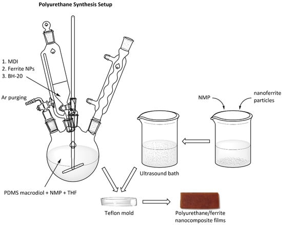 The PDMS macrodiol, MDI, catalyst (0.15 mol.% Sn(Oct)2 per mol PDMS macrodiol), and NMP/THF (9/1 v/v) were mixed in a round-bottomed flask at 60 °C for 45 min at 900 rpm. After this, ferrite nanoparticles dispersed in the NMP (using an ultrasonicator at 25 °C for 20 min) were added to the reaction mixture, and it was constantly stirred for 15 min at 60 °C. This first phase of polyaddition was monitored by the dibutylamine back-titration method [40]. In the second phase, a dilute solution of BH-20 in the NMP (20 wt.%) was added to the NCO-terminated prepolymer and mixed continuously at 70 °C for 1 h. Each mixture was then poured onto Teflon plates to obtain a dry film thickness of ~500 μm. The films were dried in a force-draft oven at 50 °C for 3 h, at 80 °C for 24 h, and then under vacuum at 60 °C for 5 h, resulting in brown, continuous films. A pristine PU film (0 wt.% nanofiller) was prepared under the same conditions. The naming codes (e.g., PUNF-60-Cu) indicate the wt.% of the soft segment and the type of ferrite used (e.g., 60 wt.% soft segment and copper ferrite in PUNF-60-Cu).
