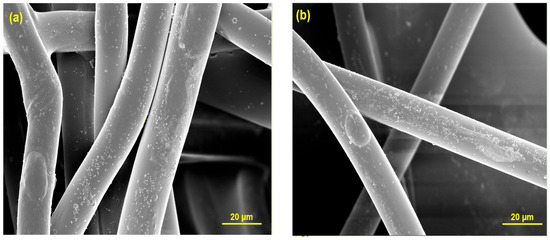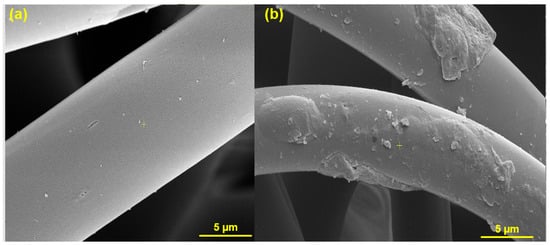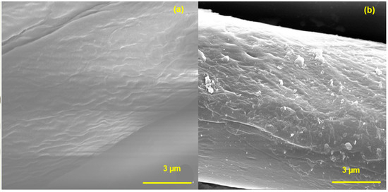 The results in Figure 3 present the comparison between the control sample of the cotton fabric (Figure 3a) and the cotton fabric coated with CNCs (Figure 3b).
