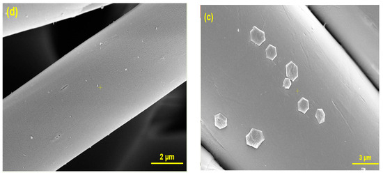 The surface morphology of the substrates (media membrane and cotton fabric) coated with CNCs was examined using HR-SEM after performing the sonochemical process on the cellulose solution as the coated sample and on the clean textiles as a control sample. Figure 2a,b shows the nanoparticles of the CNCs distributed on the surface with sizes of 40–70 nm. Often, the particles are aggregated on the membrane to form hexagons (Figure 2d). This morphology is compared with the control sample (Figure 2c) which shows a clean and smooth surface.