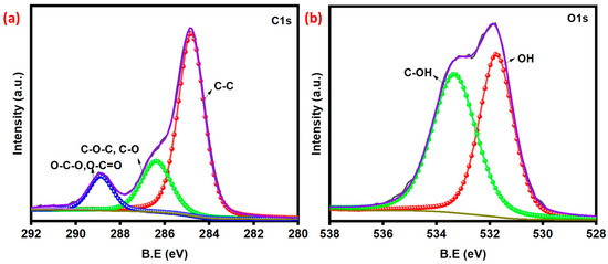 The X-ray photoelectron spectroscopy patterns of the CNC-coated membrane are shown in Figure 4, which predominantly contains the carbon and oxygen elements. As shown in Figure 4a, the C1s spectrum shows three deconvoluted peaks at 284.8 eV, 288.3 eV, and 288.8 eV, corresponding to C-C, C-O-C/C-O, and O-C-O/O-C=O functionals groups [36]. The deconvolution of the O1s spectrum (Figure 4b) shows two peaks at 531.3 eV, and 533.3 eV have been assigned to O-H and C-O-H/C-O-C functional groups [37].