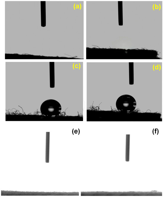 The surface wettability of the pristine and CNC-coated fabric and membrane was assessed using water contact angle measurements. In Figure 5a, the pristine media membrane exhibited no water contact on the surface. The native cellulose (MCC) coated membrane did not show any water contact in Figure 5b. A drop of water on the commercial CNC-coated media membrane was extremely spherical with a water contact angle (WCA) of 155°, corroborating its hydrophobicity (Figure 5c). This measurement was also performed on the surface that was coated by the sonochemical synthesized CNCs, which was spherical with a water contact angle of 148° (Figure 5d). When a water drop was placed on the pristine cotton and CNC-coated cotton fabric, the water was absorbed immediately (Figure 5e,f). This difference in the hydrophobicity of the two textiles is related to the fabric/structure of the membrane, due to the porous and void nature of substrates and the hydrophobic nature of CNC particles.