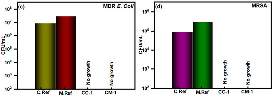 The sonochemical and commercial CNCs were studied for their antibacterial activity against four various Gram-positive and Gram-negative bacteria. The CNCs demonstrated superiority for the eradication of Gram-positive bacteria of S. aureus and Methicillin-resistant S. aureus (MRSA) as well as toward Gram-negative bacteria E. coli and multidrug-resistant (MDR) E. coli. The results indicate that the sonochemical and commercial CNCs that were coated membranes, and the cotton fabric have a rapid response to growth inhibition on the four various bacteria that were checked (Figure 6). The CNCs coated CC-1 and CM-1 show complete growth inhibition of sensitive E. coli and S. aureus in Figure 6a,b and strong antibiotic pathogens of MDR E. coli, MRSA in Figure 6c,d, whereas the uncoated substrates display 100% bacterial growth. The antibacterial differences in these CNC-coated fabrics can be associated with the synthesis and loading of CNCs on the polymer fabric. Two distinct electrical potential and nanoparticle size approaches can successfully prevent bacterial growth on CNC-coated substrates.