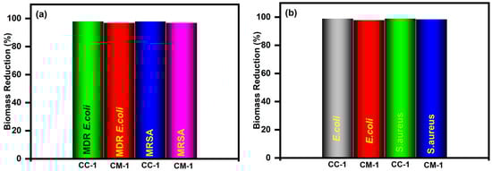 Figure 7. Biomass reduction in the CNCs coated substrates (a) MDR E. coli and MRSA and (b) E. coli and S. aureus.
