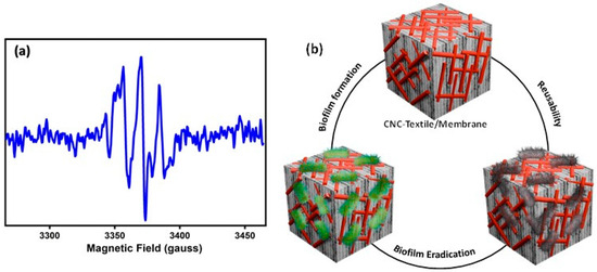 Figure 8. (a) EPR spectrum of CNCs. (b) Plausible biofilm eradication mechanism of CNC textile/membrane.