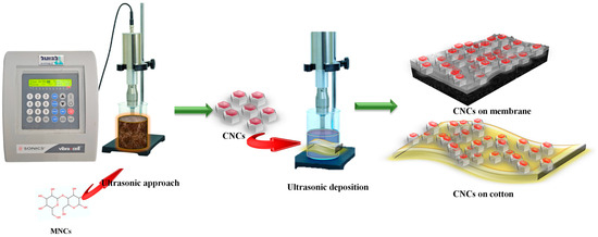 The CNC-coated membrane and cotton were prepared by ultrasonic method. The media membrane 2 cm2 was dipped in 0.1% (wt.) of CNCs, and undergoing sonication for 30 min, 30% amplitude allowed the cellulose NPs to adhere to the whole surface and create a uniform film [28,29]. In the case of the CNC-coated cotton sample, 1% (wt.) of CNCs were used to deposit on the cotton surface (2 cm2). The CNC-coated samples were immersed in water and ethanol to remove the unbonded CNC particles from the substrate surface and dried in air overnight at 60 °C. The schematic illustration of CNC sysnthesis and coating process shown in Scheme 1.