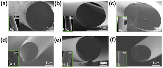 SEM images of initial fibers with different alumina additions: (a) cross-sectional surface of WP, (a1) radial surface of WP; (b) cross-sectional surface of 0.5% AL-WP, (b1) radial surface of 0.5% AL-WP; (c) cross-sectional surface of 1% AL-WP, (c1) radial surface of 1% AL-WP; (d) cross-sectional surface of 1.5% AL-WP, (d1) radial surface of 1.5% AL-WP; (e) cross-sectional surface of 2% AL-WP, (e1) radial surface of 2% AL-WP; (f) cross-sectional surface of 2.5% AL-WP, (f1) radial surface of 2.5% AL-WP.