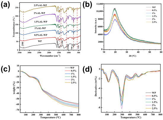 (a) Infrared spectra of WP and AL-WP; (b) XRD patterns of WP and AL-WP; (c) TG curves of WP and AL-WP; (d) DTG curves of WP and AL-WP.