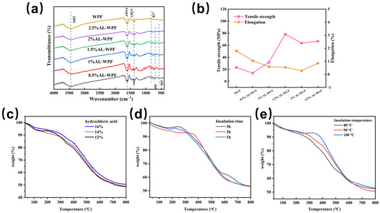 (a) Infrared spectra of WPF and AL-WPF under thermal curing conditions; (b) tensile strength and elongation at break of WPF and AL-WPF under thermal curing conditions; (c) TG curves of AL-WPF under curing conditions with different hydrochloric acid concentrations; (d) TG curves of AL-WPF under curing conditions with different holding times; (e) TG curves of AL-WPF under curing conditions with different holding temperatures.