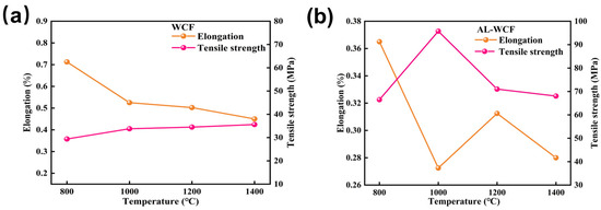 Tensile strength and elongation at break of nano-alumina-modified wood liquefaction carbon fibers at different temperatures: (a) WCF; (b) AL-WCF.