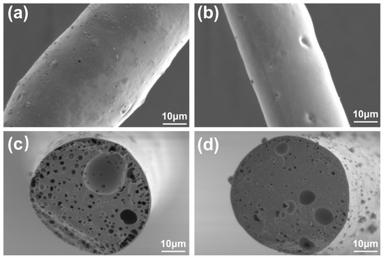 Figure 5 shows the SEM images of carbon fibers at a carbonization temperature of 1000 °C. Figure 5a,c show that the surface of WCF exhibits a distinct porous structure with the edges of the cross-section being relatively rough and the skin–core structure more pronounced. Additionally, the surface and core layer of the carbon fibers display uneven graphitization, leading to an increased disparity between the external and internal structures. After nano-alumina modification, the carbon fibers shown in Figure 5b,d exhibit a more orderly and uniformly compact cross-sectional structure. The skin–core structure is less pronounced than the unmodified fibers, and tiny pores are observed in the central region. This is speculated to be due to the gases generated during the high-temperature decomposition reaction in the carbonization process of nano-alumina, which may have caused defects in the fiber structure.