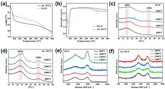 (a) TG curves of WCF and AL-WCF; (b) DTG curves of WCF and AL-WCF; (c) XRD spectra of WCF at different carbonization temperatures; (d) XRD spectra of AL-WCF at different carbonization temperatures; (e) Raman spectra of WCF at different carbonization temperatures; (f) Raman spectra of AL-WCF at different carbonization temperatures.