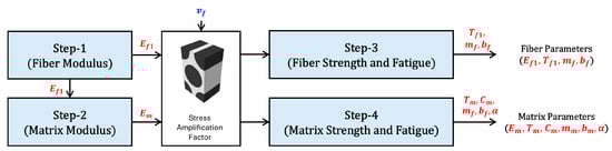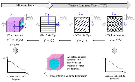 Physically, constituents of fiber and polymer matrix construct a ply, thus the properties of a ply are determined by the properties of constituents and their respective content ratios. The plies are then stacked and laminated with ply angles, forming a laminate. If the laminate consists of balanced angles, such as plus and negative angles, with respect to a reference axis, the laminate is called a biaxial (BX) laminate. Obviously, the mechanical response of the BX laminate under mechanical and environmental conditions is determined with the constituent properties. The current procedure for the fatigue analysis of fiber-reinforced composite laminates using a multiscale approach is illustrated in Figure 1.