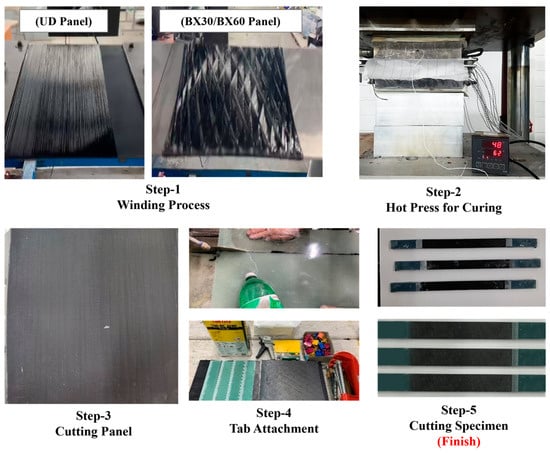 The panels were fabricated via a filament winding process at specific angles as illustrated in Figure 3. The winding angles were [0°]s, [+30°/−30°]s, and [+60°/−60°]s, UDL, BX30, and BX60 laminates, respectively, as shown in Table 4. After winding, the panels were cured under a constant pressure of 0.65 MPa at 80 °C for 4 h, followed by an additional 4 h at 120 °C. Specimens were prepared by attaching tabs with acrylic-based Loctite 401 adhesive and cutting them to the specified angles for testing according to ASTM-D3039 standards [].