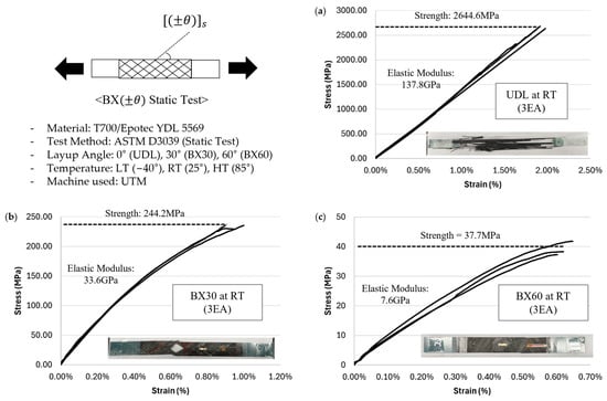 The elastic modulus of UDL, BX30, and BX60 reached 137.8 GPa, 33.6 GPa, and 7.6 GPa, respectively, while their tensile strengths reached 2644.6 MPa, 244.2 MPa, and 37.7 MPa. According to the TDS of Toray’s T700 [], the elastic modulus and tensile strength of UDL laminates are 135 GPa and 2550 MPa, respectively, with an error of 2.07% in elastic modulus and 3.71% in tensile strength. Despite differences in the polymer matrix, the test data for UDL laminates are very similar to the reference data, supporting the reliability of the results. The static test results for UDL, BX30, and BX60 under RT conditions are shown in Figure 4, while the summary of averaged static test results under LT, RT, and HT conditions is presented in Table 5.