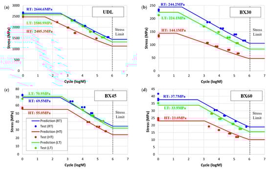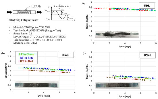 Fatigue tests were conducted on the same laminates: UDL, BX30, and BX60 following ASTM-D3479 standards [] at room temperature (RT: 25 °C), high temperature (HT: 85 °C), and low temperature (LT: −40 °C). Each laminate was tested at four different load levels, i.e., 50%, 60%, 70%, and 80% of the ultimate strength of each laminate; the SN curves of the fatigue tests are shown in Figure 5. The stress levels were based on the ultimate strength rather than the yield strength because defining the yield strength in composites is challenging due to the nonlinear behavior caused by the polymer matrix.