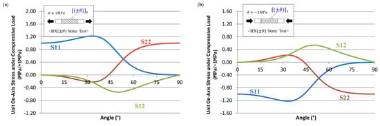 For BX laminates, polymer matrix failure is the primary cause, with the tensile strengths of BX30, BX45, and BX60 predicted to be 247.3 MPa, 69.5 MPa, and 37.1 MPa, respectively. These values are based on actual experimental data and were used to determine the strength of the polymer matrix. The compressive strengths for BX30, BX45, and BX60 were predicted to be 116.7 MPa, 77.8 MPa, and 95.3 MPa, respectively, with estimates derived from the tensile strength experimental values. For BX30, the tensile strength was predicted to be higher than the compressive strength, whereas for BX45 and BX60, the compressive strength was predicted to be higher than the tensile strength, as shown in Figure 6.