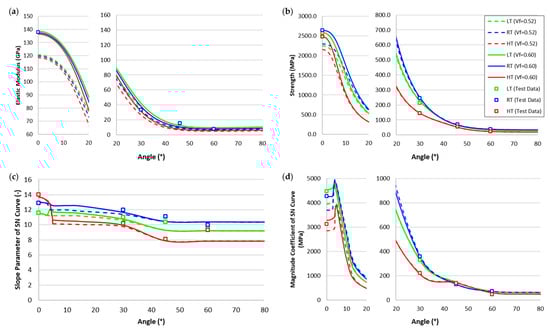 Prediction results of BX laminates under 0–80° and test data at RT (in blue), HT (in red), and LT (in green): (a) elastic modulus; (b) strength; (c) slope parameter of the SN curve; (d) magnitude coefficient of the SN curve.
