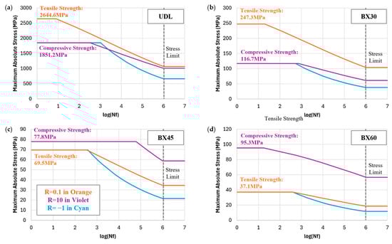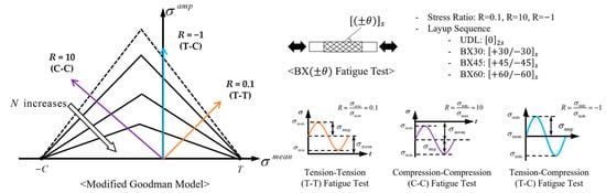 Parametric study was performed to predict fatigue analysis results of various stress ratios using a modified Goodman model, and specifically determined material properties by fatigue test under tension–tension fatigue tests (T-T), as shown in Figure 9. The analysis covers various laminate configurations, including UDL, BX30, BX45, and BX60. Here, the stress ratio is defined as the minimum load divided by the maximum load, and the analysis incorporates common stress ratios used in composite fatigue testing: R = 0.1, 10, and −1. Specifically, R = 0.1 corresponds to T-T fatigue tests, R = 10 to compression–compression fatigue tests (C-C), and R = −1 to tension–compression fatigue tests (T-C).