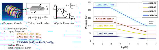 This section demonstrates the application of the current multiscale-based fatigue life prediction of composite pressure vessels under cyclic loads. Pressure vessels are typically wound with multiple biaxial angle laminates. Figure 11 shows the comparison cases of three biaxial laminates and one double biaxial laminate subjected to the multiaxial loading resulting from internal pressure, which was applied with a stress ratio of 0.1. The predicted SN curve was analyzed by dividing it into three parts—strength, fatigue life curve, and limit stress—according to Figure A1b in Appendix A.