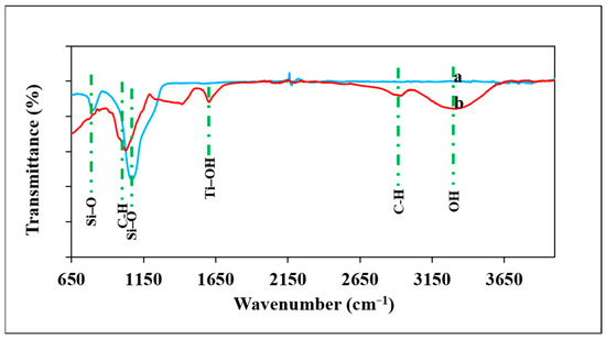 FTIR spectra of (a) Pennisetum glaucum-derived biogenic silica and (b) SiO2/TiO2/gum arabic nanocomposite.