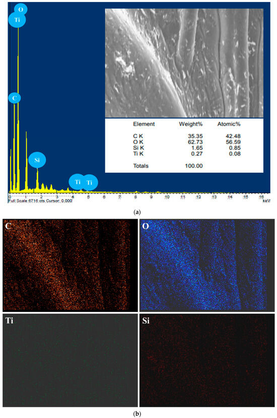 (a) Energy-dispersive X-ray diffraction (EDX) spectrum of SiO2/TiO2/gum arabic nanocomposite and (b) elemental mapping of prepared SiO2/TiO2/gum arabic nanocomposite.