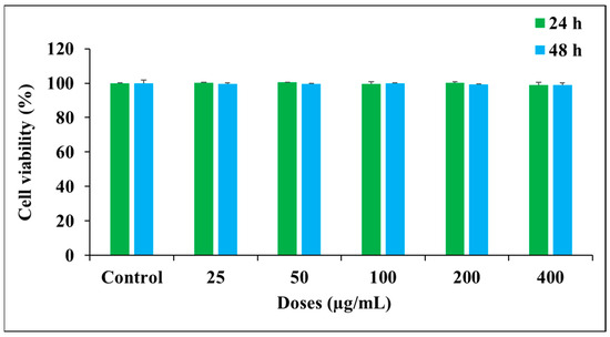 The impact of SiO2/TiO2-embedded gum arabic powder on human mesenchymal stem cell viability was examined using the MTT assay described previously [38]. The 96-well plate was plated with around 1 × 104 cells per well. Following 80% confluence, the cells were exposed to different doses of testing material for 24 and 48 h. After exposure, 20 µL of MTT dye at 5 mg/mL concentration in phosphate buffer saline (PBS) was poured into each well of the plate, and the plate was incubated for 4 h. After carefully aspirating the cell culture media, 200 µL of dimethyl sulfoxide (DMSO) was added to each well. The absorbance of the plate was measured using a microplate reader at 570 nm and 650 nm. Cell viability of human mesenchymal stem cells was calculated from the obtained results.